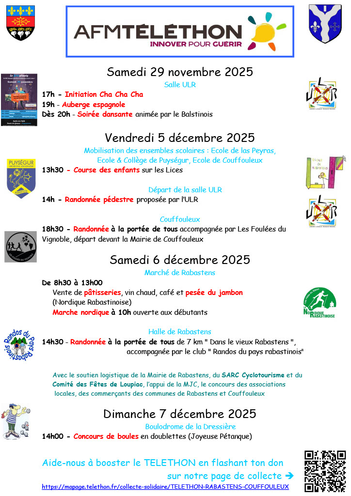 • En nous retrouvant sur les différents évènements organisés : auberge espagnole et bal populaire le 29 novembre, marche nocturne le 5 décembre à Couffouleux, ventes sur le marché de Rabastens samedi 6 matin et randos diverses … La programmation complète arrive prochainement.
