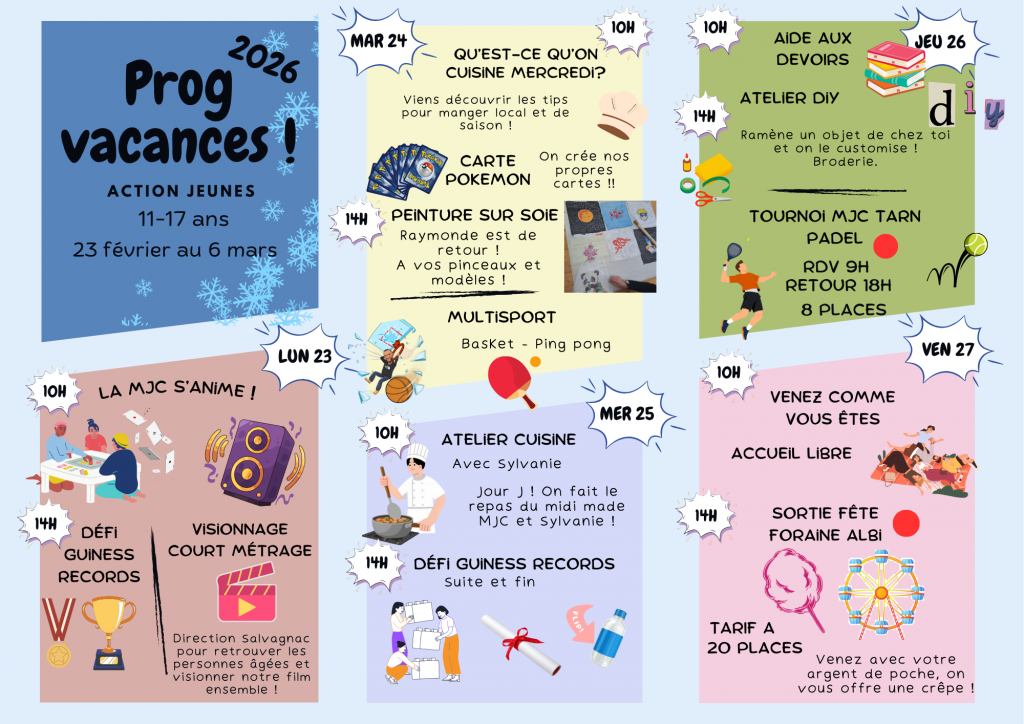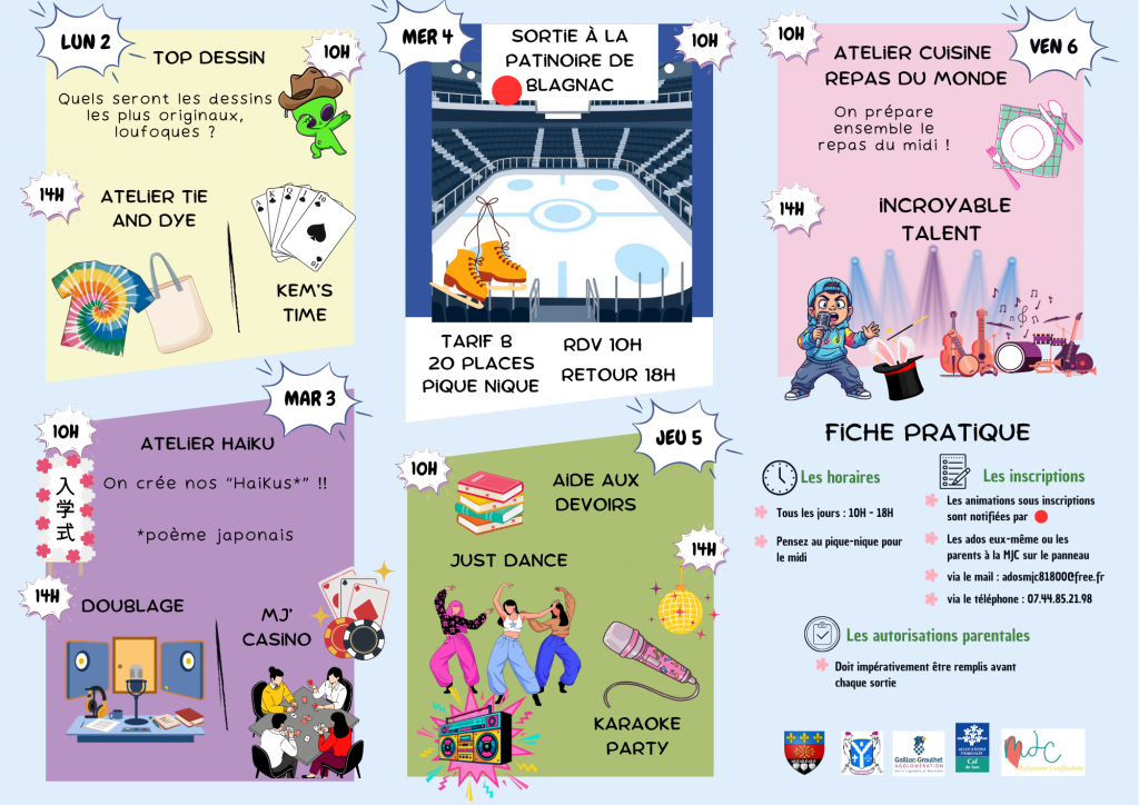 Attention, certaines animations et sorties sont soumises à inscription avec un nombre de places limité… Nous ne serons pas en capacité d’accueillir les jeunes non-inscrits au préalable. Ne tardez pas à vous inscrire 😉