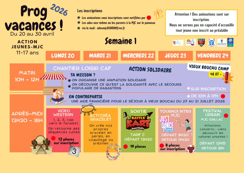 Attention, certaines animations et sorties sont soumises à inscription avec un nombre de places limité… Nous ne serons pas en capacité d’accueillir les jeunes non-inscrits au préalable. Ne tardez pas à vous inscrire 😉